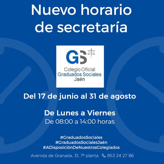Atención colegiados 𝗛𝗼𝗿𝗮𝗿𝗶𝗼 𝗱𝗲 𝘃𝗲𝗿𝗮𝗻𝗼 a partir del 17 de junio y hasta el 31 de agosto De lunes a viernes de 08:00 a 14:00 horas #GraduadosSociales#GraduadosSocialesJaén Todas las reacciones: 22